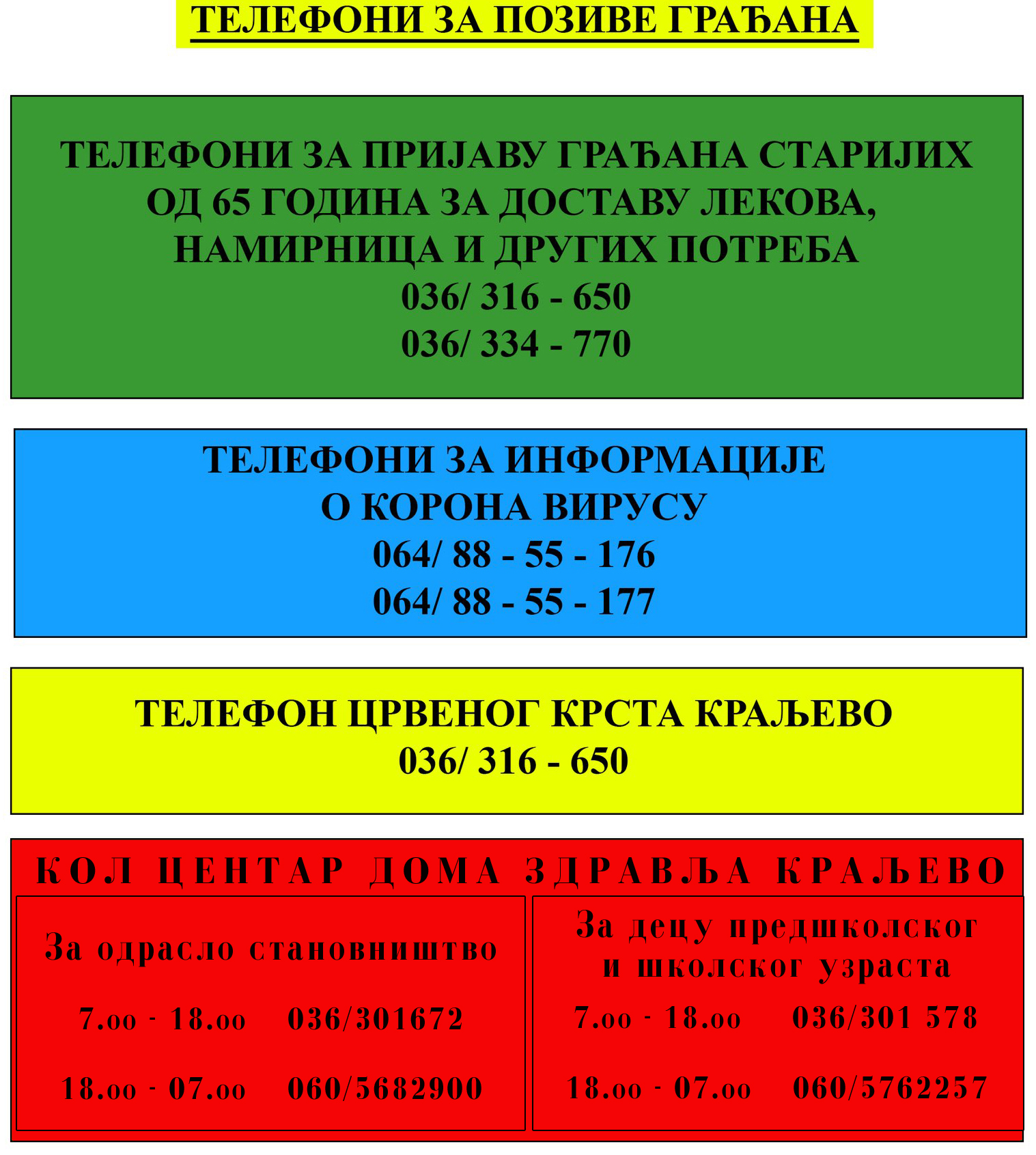 Градски штаб за ванредне ситуције на територији града Краљева је у сталном заседању од проглашења ванредног стања. Седница Градског штаба се одржавају свакодневно, у циљу координације свих активности предвиђених „Планом заштите и спасавања од епидемија – пандемија“, који је усвојен од стране Градског штаба на првој седници након проглашења ванредног стања.
